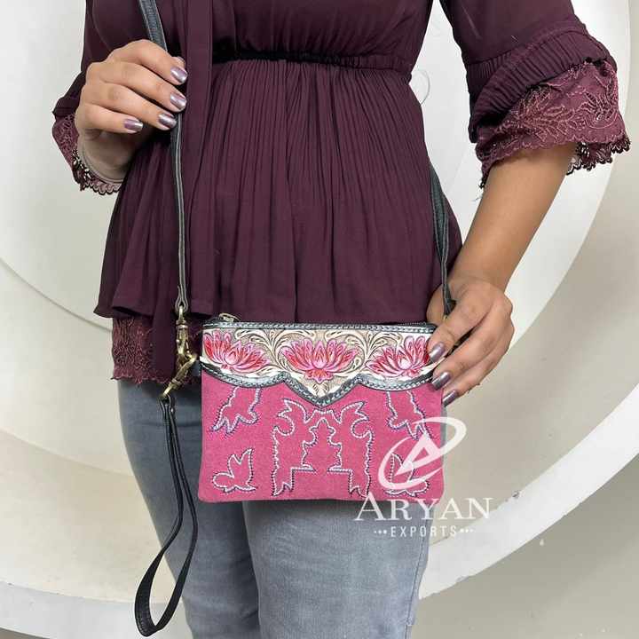 Product name:Hand Tooled Suede Leather Crossbody Bag with Wristlet
