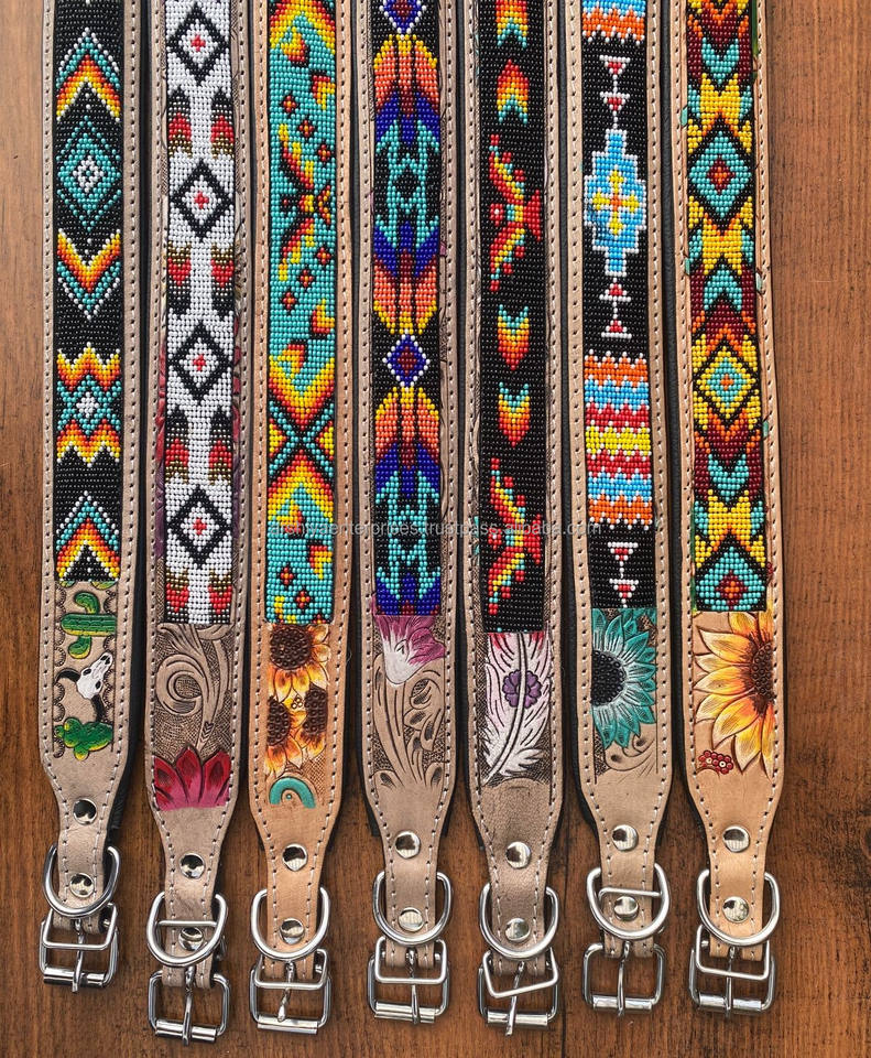 New Product Designer High Quality Hand Tooled Leather Adjustable Beaded Pet Collar Luxury Handmade Cowhide Leather Dog Collar