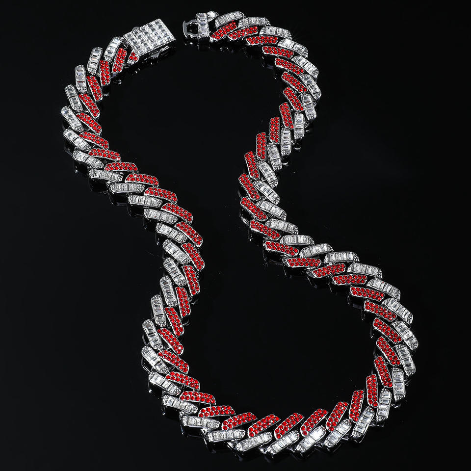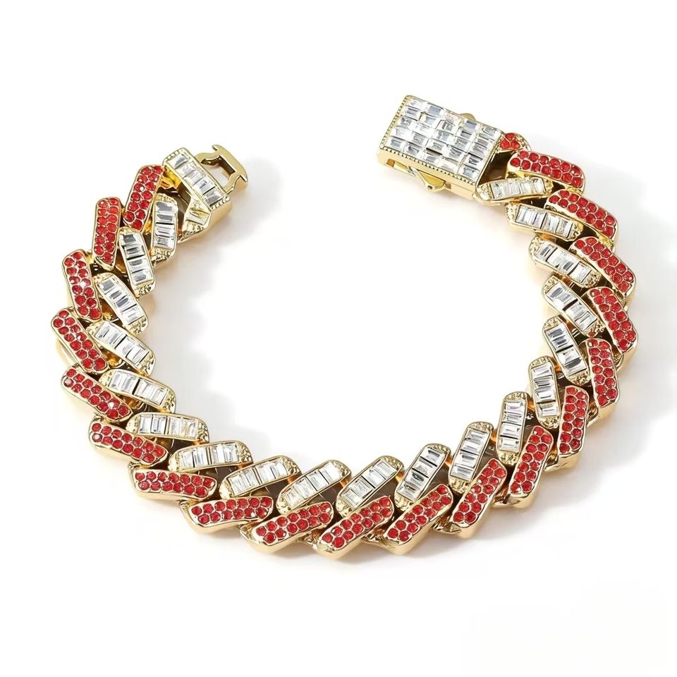 New Product Personalized Red Rhinestone Cuban Link Chain Hip Hop Style Double Color Men's Chain Bracelet Wholesale Jewelry