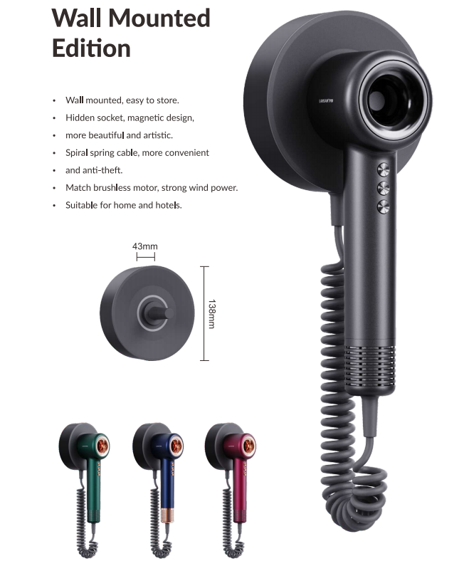 New Product 120,000rpm High Speed Low Noise Wall Mounted Hair Dryer-Ionic Tamper-proof Electric for Home or Hotel Use