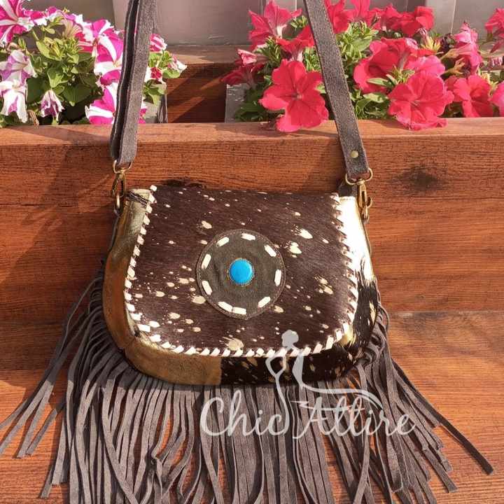 New Real Hair on Hide Metallic Fur Leather Crossbody Bag Western Style Suede Leather Fringe Middle Stone Sling Purse Women Gifts