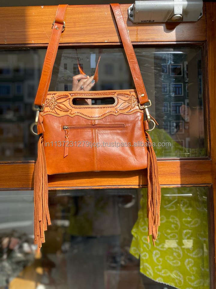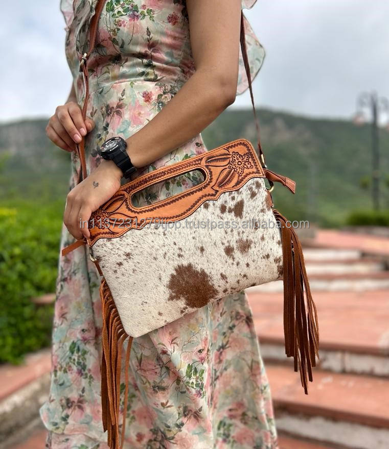 New Real Hand Tooled Cowhide Fur Leather Fringe Bags Stylish Western Color Tooled Leather Sling Bags Ideal Top Handle Side Bags