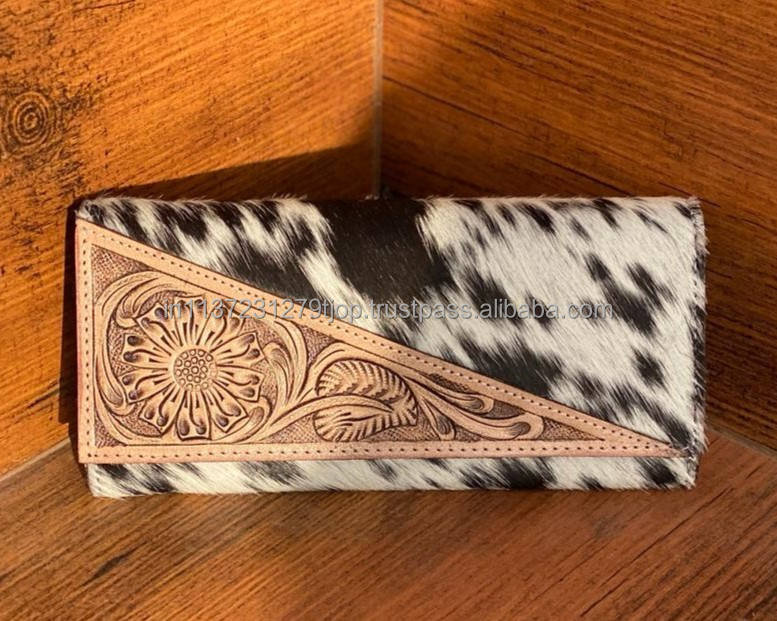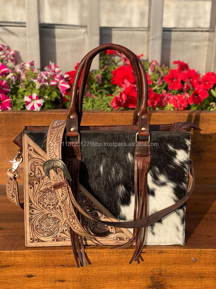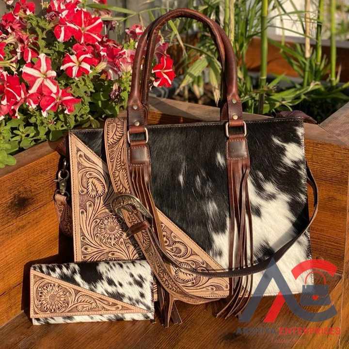 New Real Hand Tooled Floral Print Cowhide Fur Leather Tote Bag New Western Stylish Tooled Fur Leather Clutch Combo Set