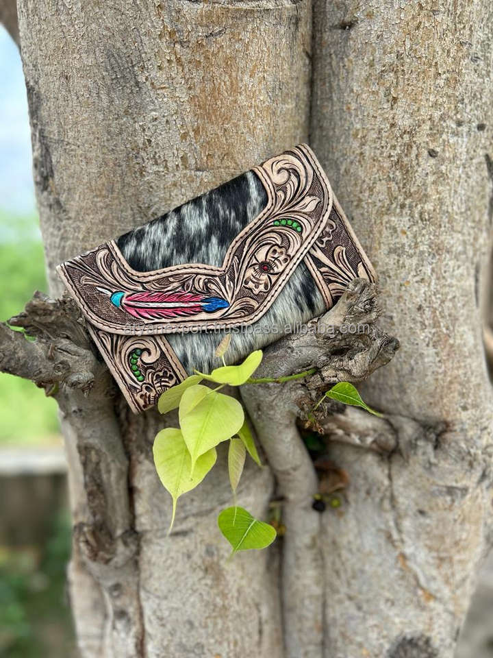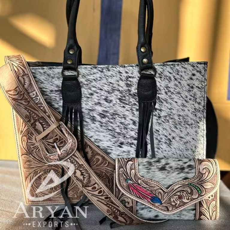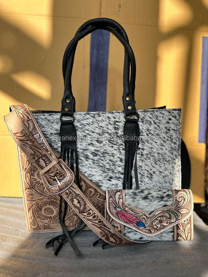 New Real Hand Tooled Floral Print Cowhide Fur Leather Tote Bag New Western Cowhide Fur Color Tooled Fur Leather Clutch Combo Set