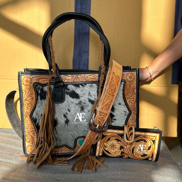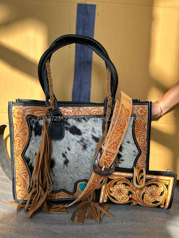 New Real Hand Tooled Floral Print Cowhide Fur Leather Tote Bags Western Stylish Evening Bag and Tooled Clutch Unique Combo Sets