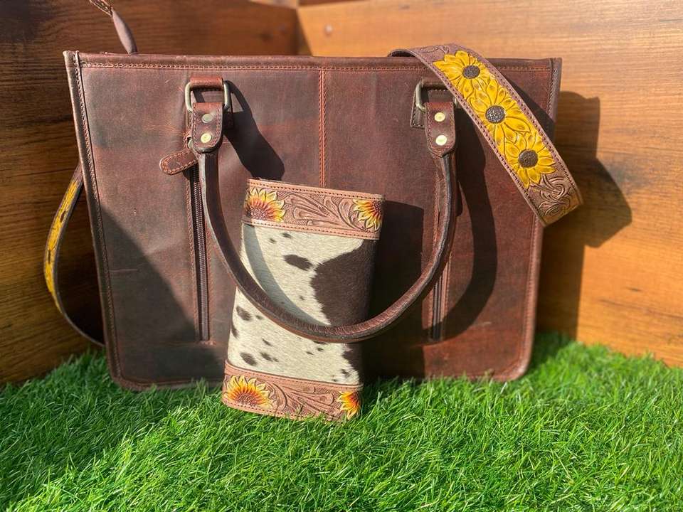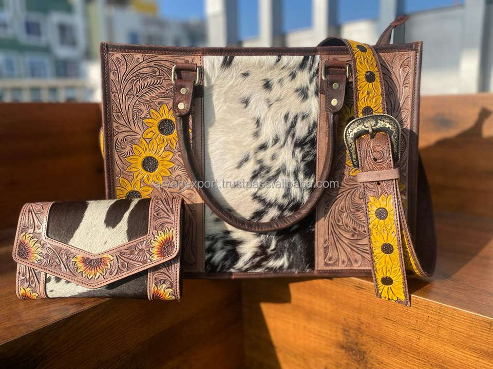 New Real Hand Tooled Floral Print Cowhide Fur Leather Tote Bag New Western Cowhide Fur Color Tooled Fur Leather Clutch Combo Set