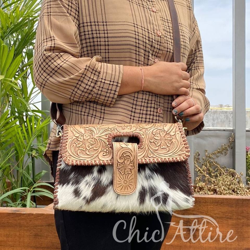 New Real Hand-Tooled Leather Crossbody Bag for Women's Western Style Genuine Leather Brown Floral Clutch Handbag Cowhide Purse