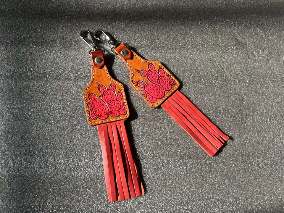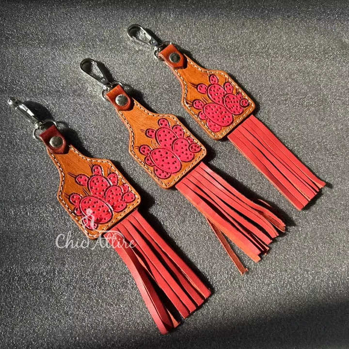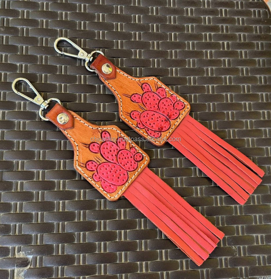 New Real Handcrafted Genuine Color Tooled Leather Cute Charming Tassel Keyrings Hot Sale Western Style Modern Floral Key Fobs