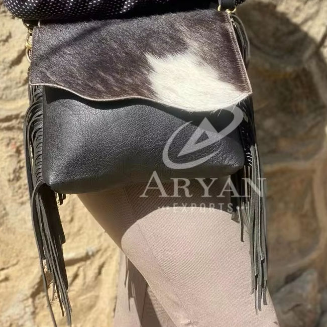 New Real Handmade Hair on Hide Fur Fringe Bag Stylish Women Tassel Leather Fringe Bags Cowhide Fur Leather Bohemian Shoulder Bag