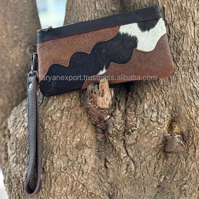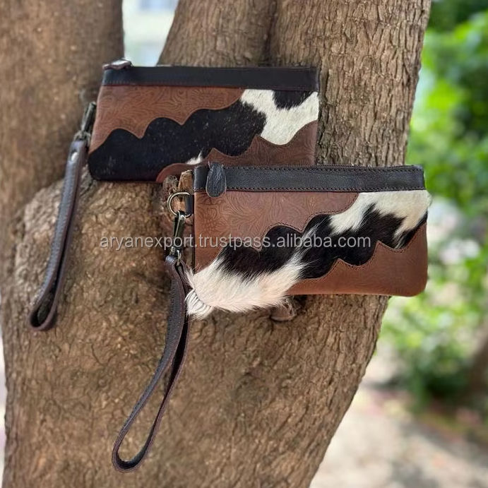 New Real Handmade Hair on Hide Embossed Print Fur Leather Wristlet Clutch Hot Selling Women Designed Hand Painted Zipper Pouches