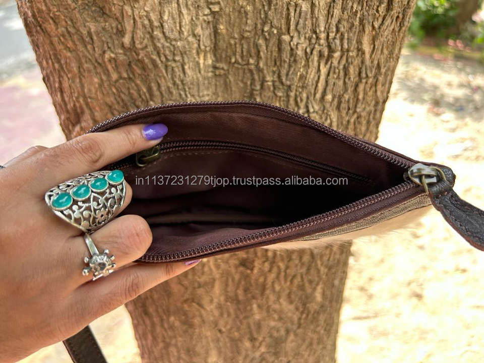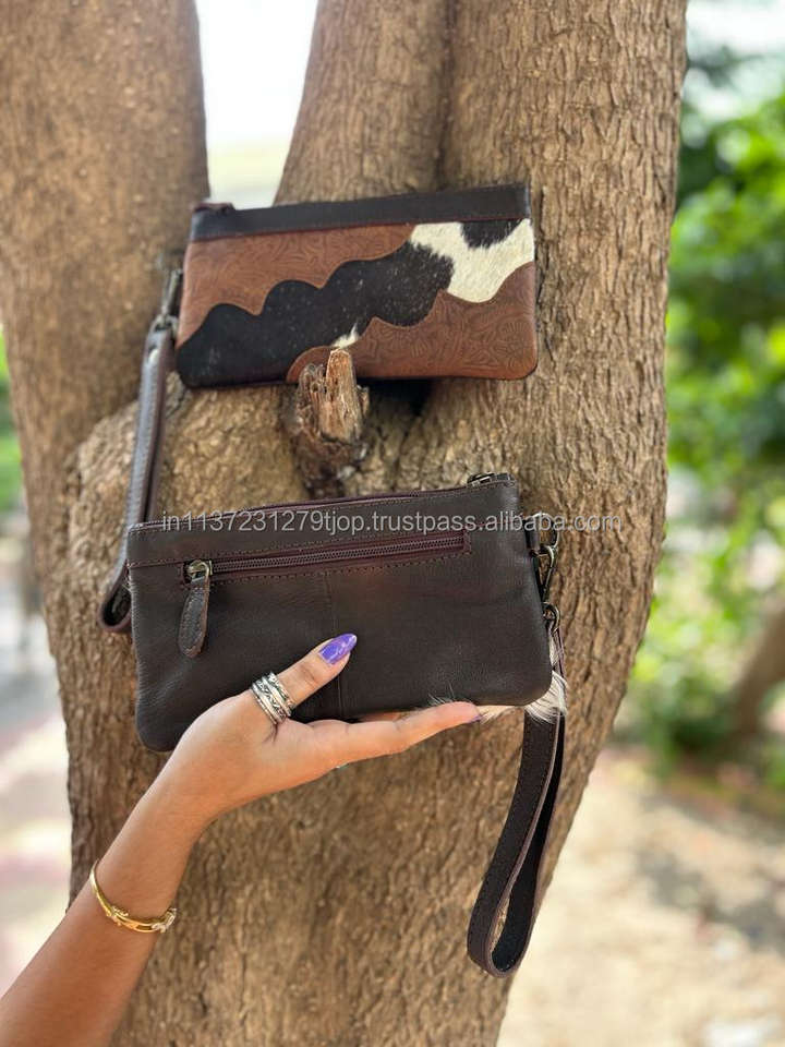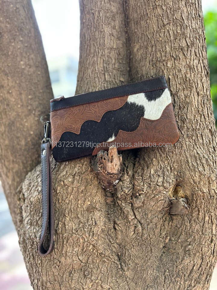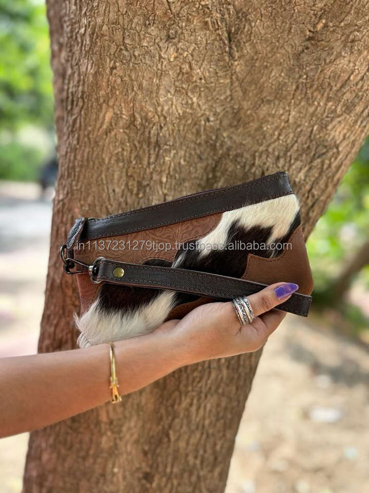 New Real Handmade Hair on Hide Embossed Print Fur Leather Wristlet Clutch Hot Selling Women Designed Hand Painted Zipper Pouches