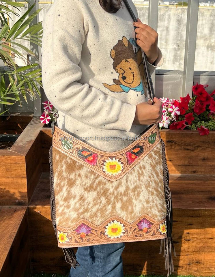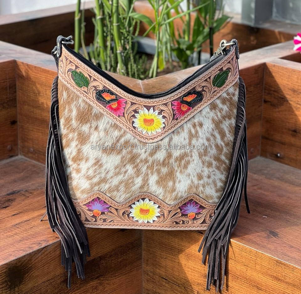 New Real Handmade Stylish Hair on Tooled Cowhide Leather Boho Fringe Sling Bags Western Fashionable Women Tassel Shoulder Bags
