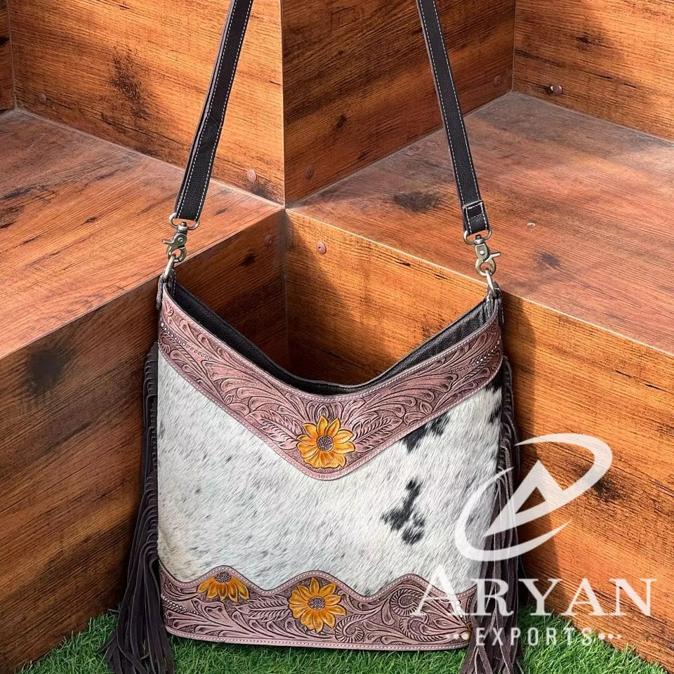 New Real Handmade Stylish Hair on Tooled Cowhide Leather Boho Fringe Sling Bags Western Fashionable Women Tassel Crossbody Bags