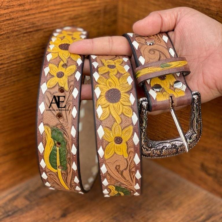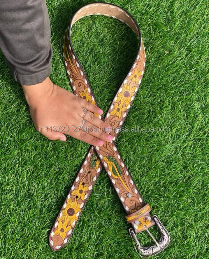 New Real High Quality Genuine Tooled Leather Western Sunflower Waist Belts Stylish Handmade Tooled Carved Leather Unisex Belts