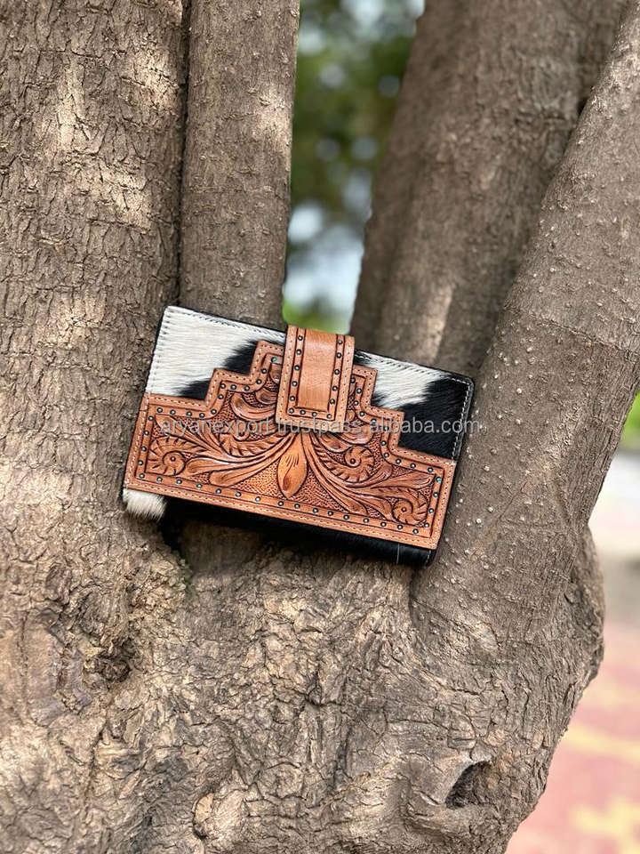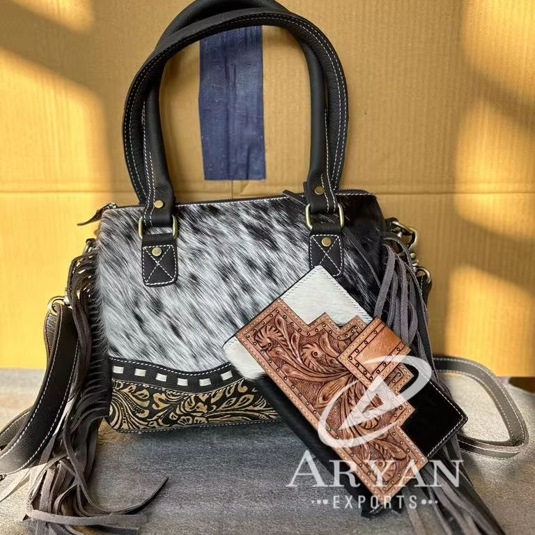 New Real Western Hand Embossed Print Cowhide Fur Leather Handbag Women Stylish Bag and Hand Tooled Fur Clutch Unique Combo Sets