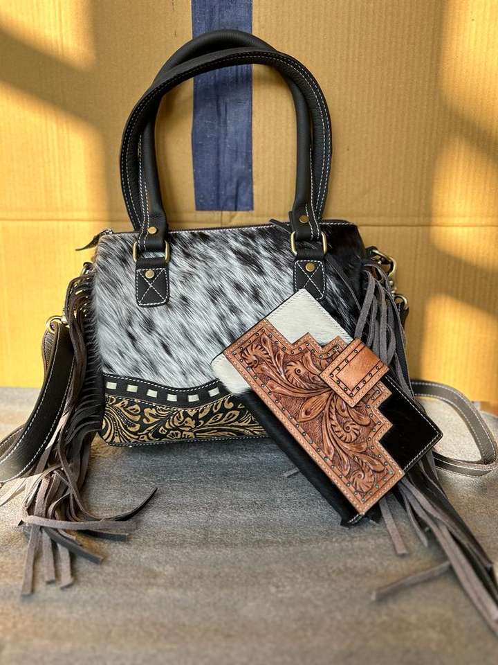 Hand Tooled Cowhide Leather Fringe Handbags & Wallet Set