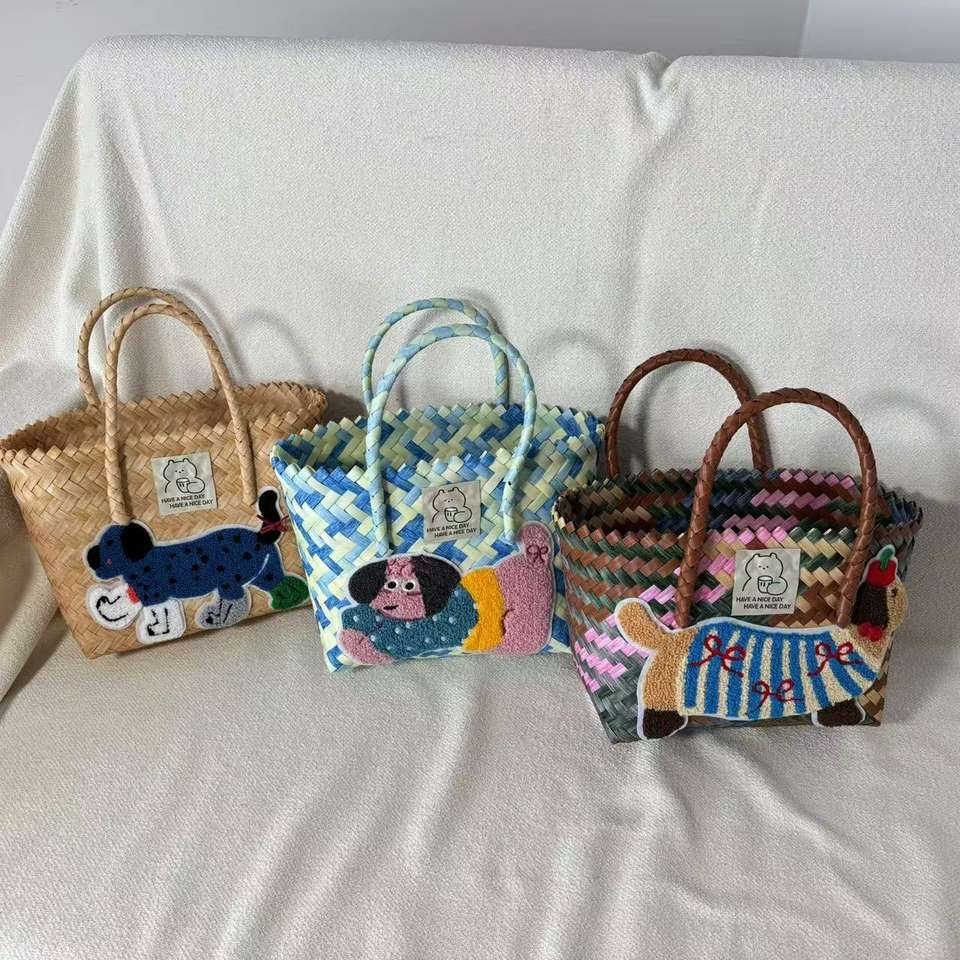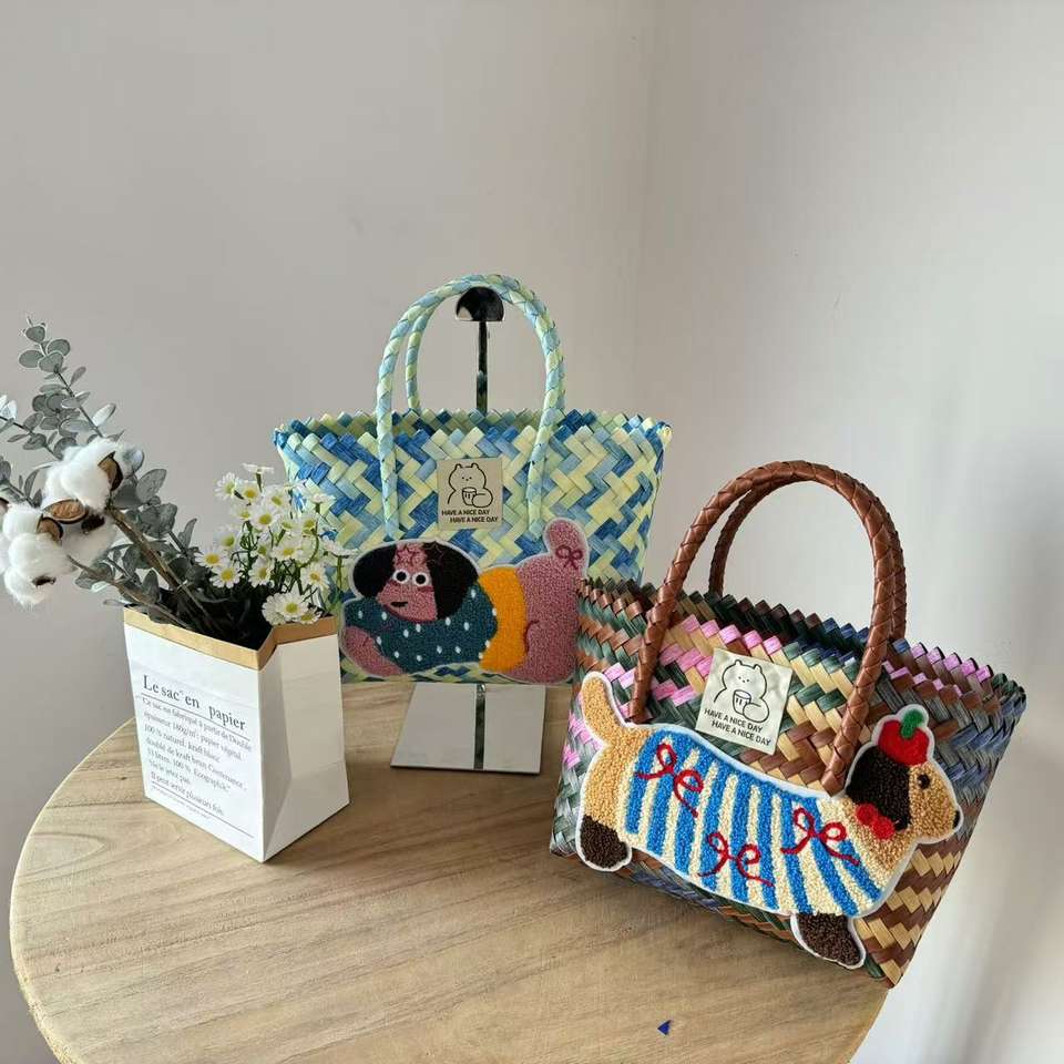New Retro Striped Dachshund Woven Bag for Travel Vacation Daily Commuting Shopping PVC Lining Open Closure Embroidery 20x15x10cm