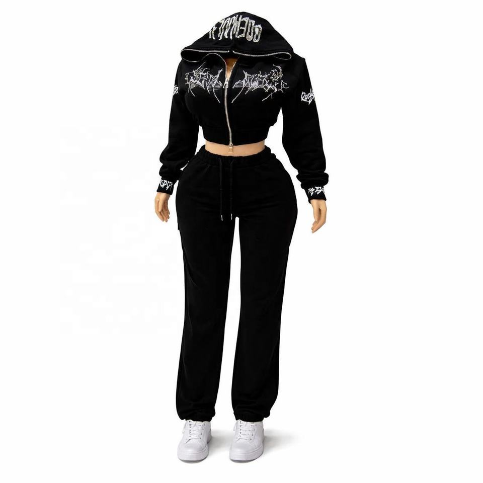 New Rhinestone Tracksuit Streetwear Set Crystal Full Zip Hoodie Wide Leg Joggers Baggy Unisex Gothic Aesthetic Black Sweatsuit