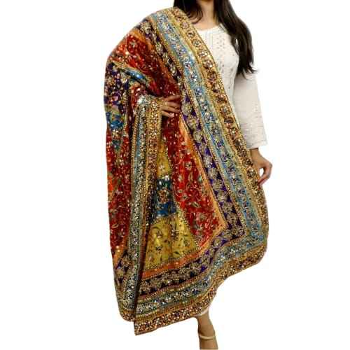 New Season Handmade Ethnic Silk Long Dupatta with Colorful Floral Threadwork Mirror Pieces and Kaudi Shells