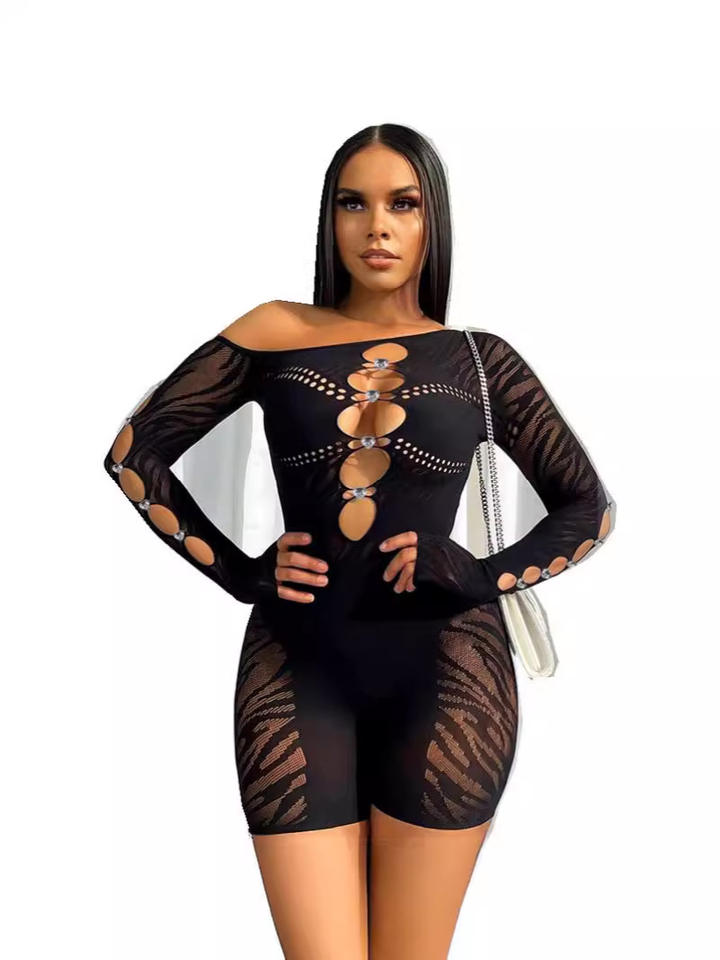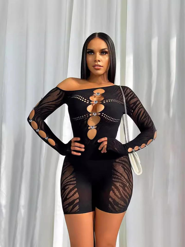 New Solid Color Hollowed Out Diagonal Shoulder Long Sleeved Bright Revealing Chest Sexy One-piece Women's Clothing