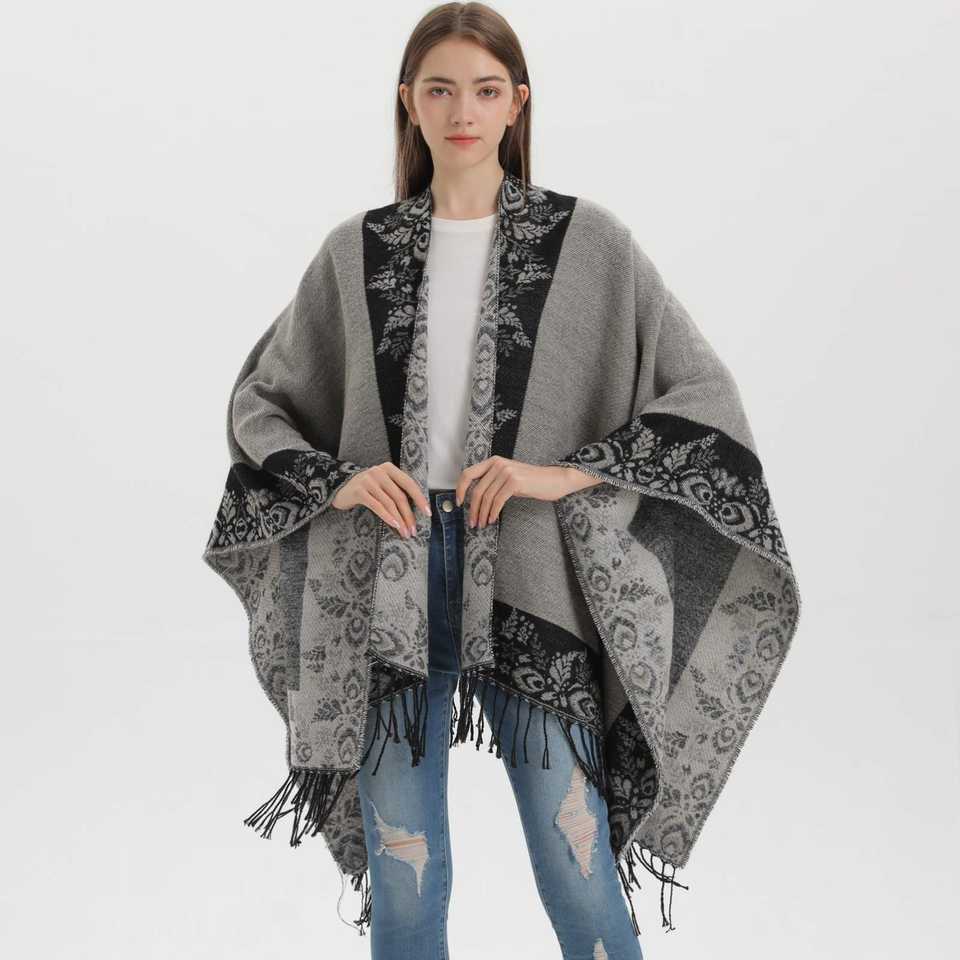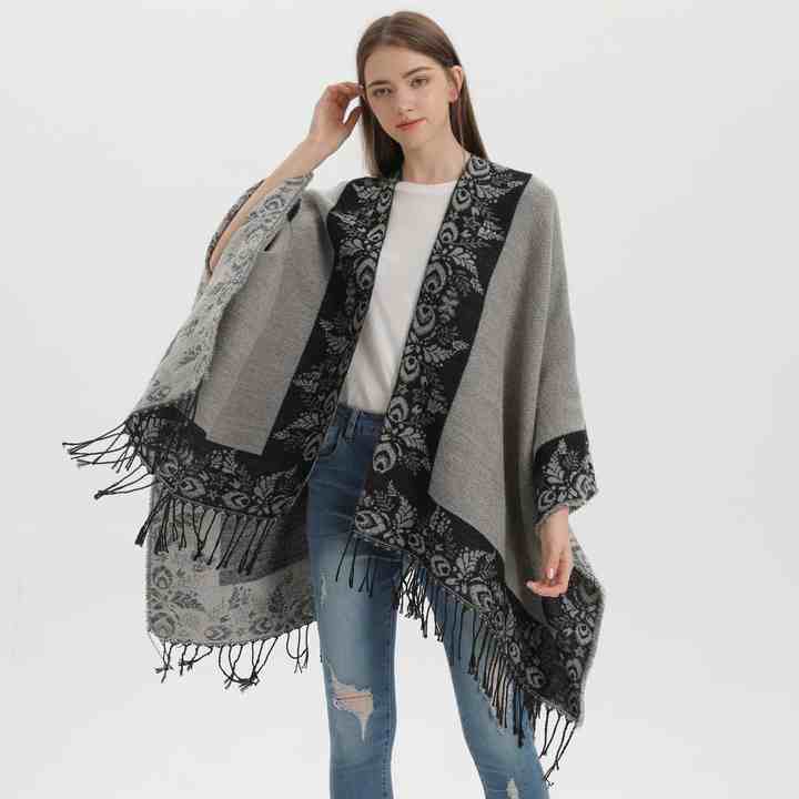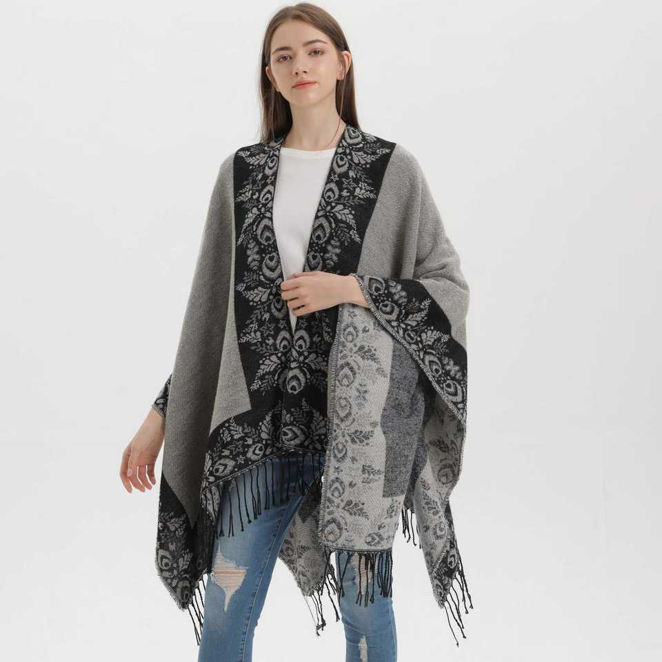 New Split Shawl Autumn Winter Cashmere Warm Tassel Cape Scarf One Piece Leaf Argyle Retro Ethnic Reversible Dropshipping