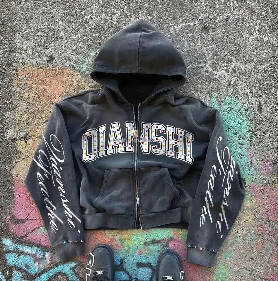 New Streetwear Hoodie Design Spring Distressed Acid Wash Double Zip Hoodie Customized Oversized Rhinestone Zip up Hoodie Men