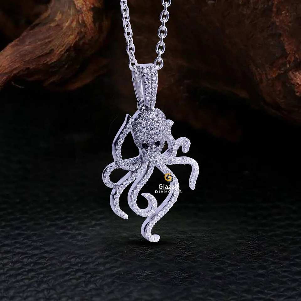 New Stunning Fully Iced Out Octopus Pendant Round Brilliant Lab Grown Diamond VVs Clarity 10Kt White Gold For Unisex D Colorless