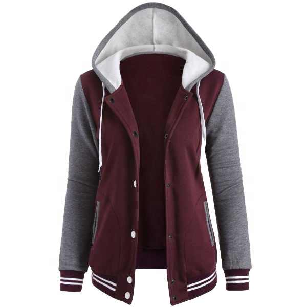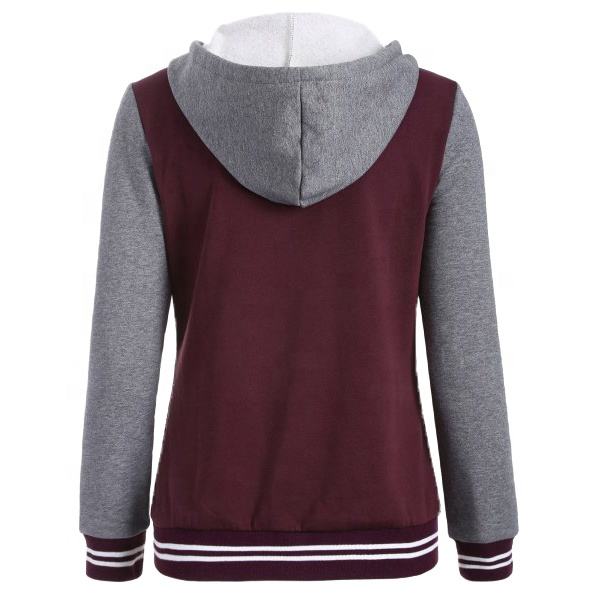 New Style Customized Wholesales Contrast Sleeve & Hoodie Women Varsity Jacket Button Open with Stripe Cuff Bottom 2024
