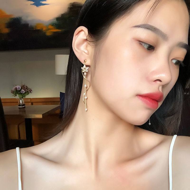 New Style Face Slimming Five-Pointed Unisex Long Elegant Internet Celebrity Tassel Earrings Wave Line Star Alloy Garnet