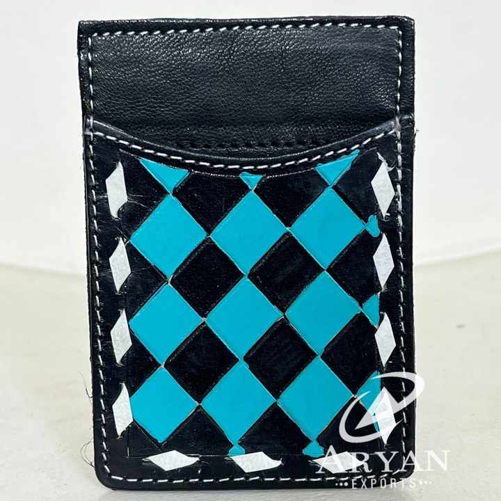 Hand Tooled Checkered Leather Credit Card Holder Wallet