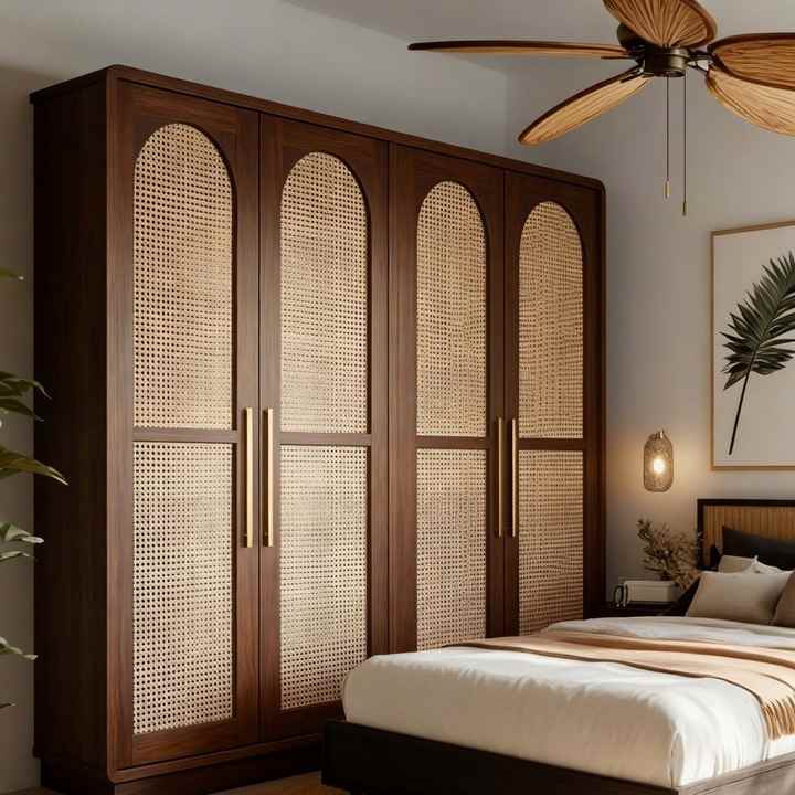 New Style Hot Selling Walnut & Rattan Arch-Door Wardrobe Modern Spacious Bedroom Storage Furniture Organization