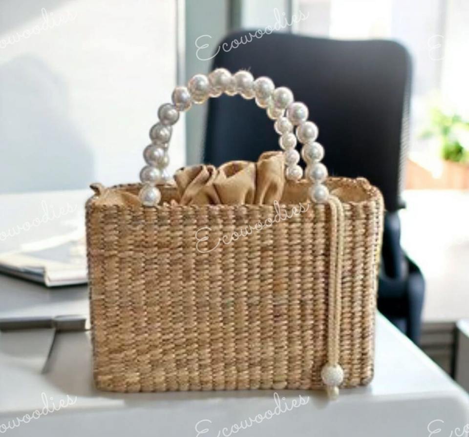 New Style Natural Color Ladies Bag for Women Fashion Summer Rattan Woven Wicker Tote Bag with Pearl Ornaments Womens Handbag