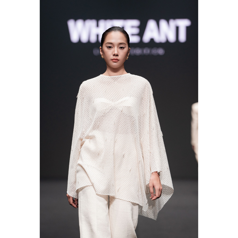 New Style WHITE ANT Mesh Lace Cape ORAN EMB LACE CAPE With Round Neck Back Button Relief 64% Organic Cotton 36% Polyester