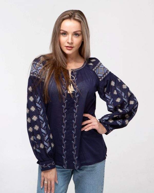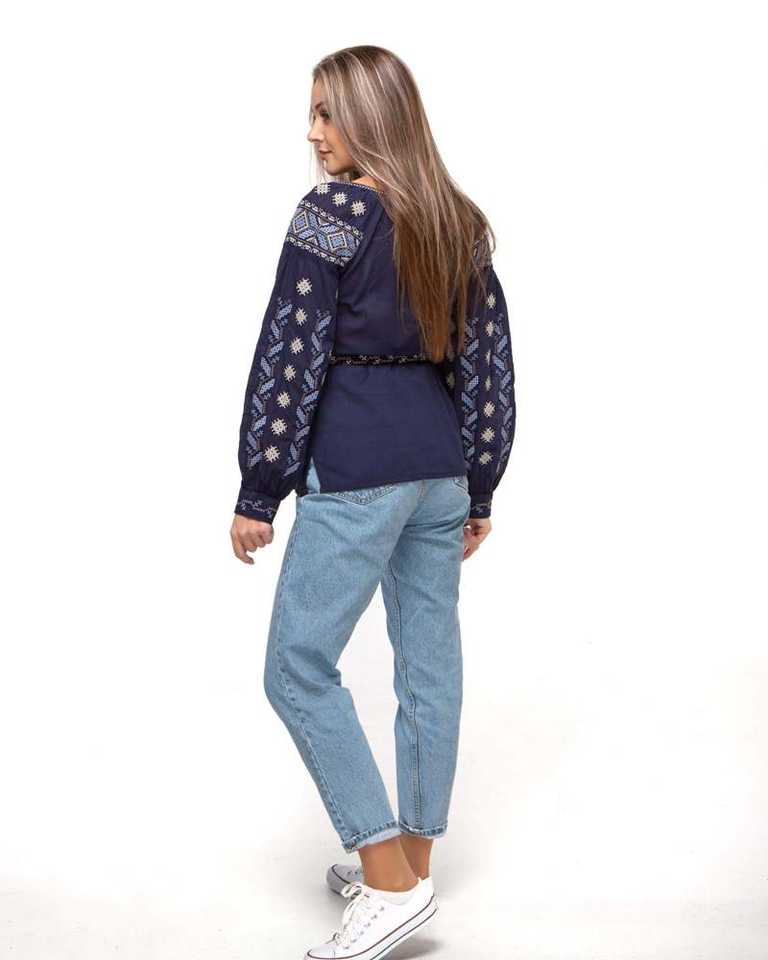 New Style Women's Blue Cotton Tunic Top XL Plus Size Casual Long Length Embroidered Lace Decoration Full Sleeves Woven Digital