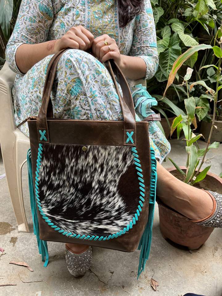 New Stylish Hair On Cowhide Leather Tote Bag Double Handle Back Zipper Pocket Faishonable High Quality Fringed Shopping Bag