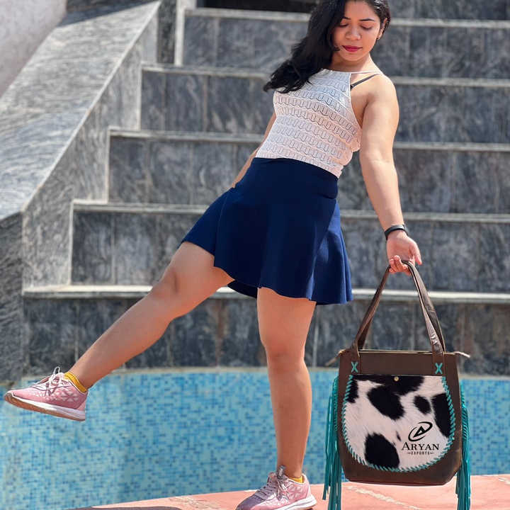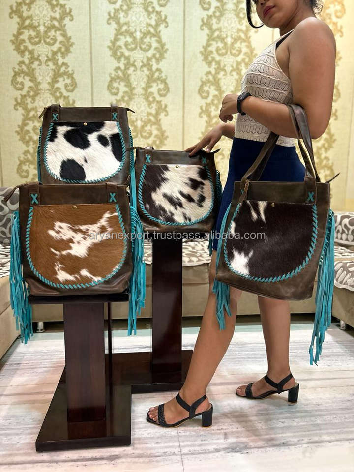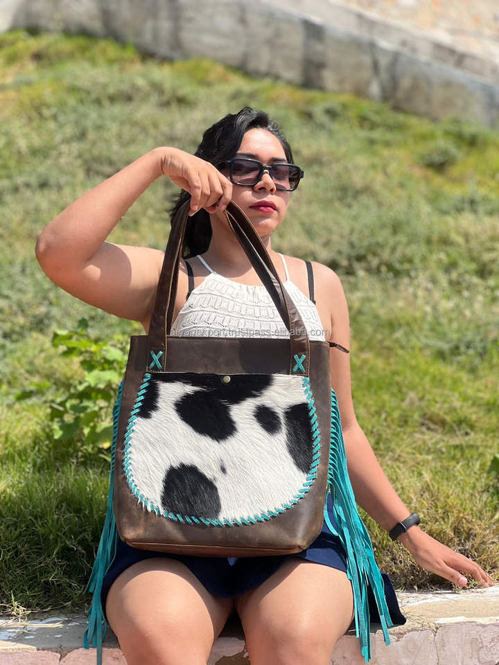 New Stylish Hair on Hide Fur Leather Tote Bag Women Shoulder Bag Handbag Fashionable High Quality Turquoise Fringed Shopping Bag