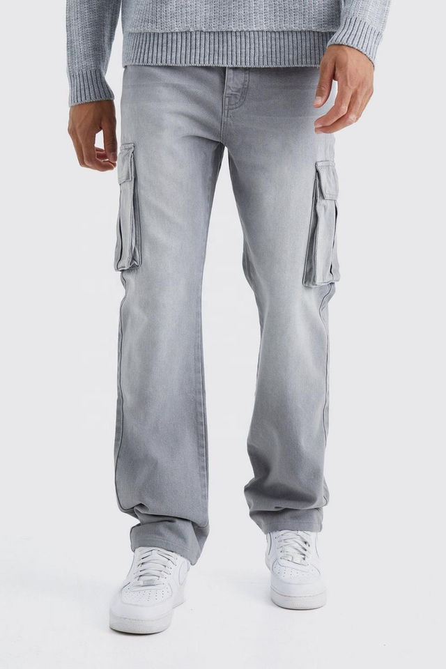 New Stylish Relaxed Fit Tall Men Rigid Cargo Jeans Stretchable High Street Cargo Pockets Denim Jeans in Mid Grey Color