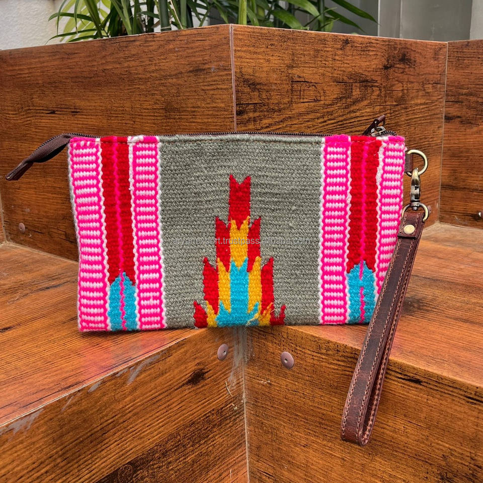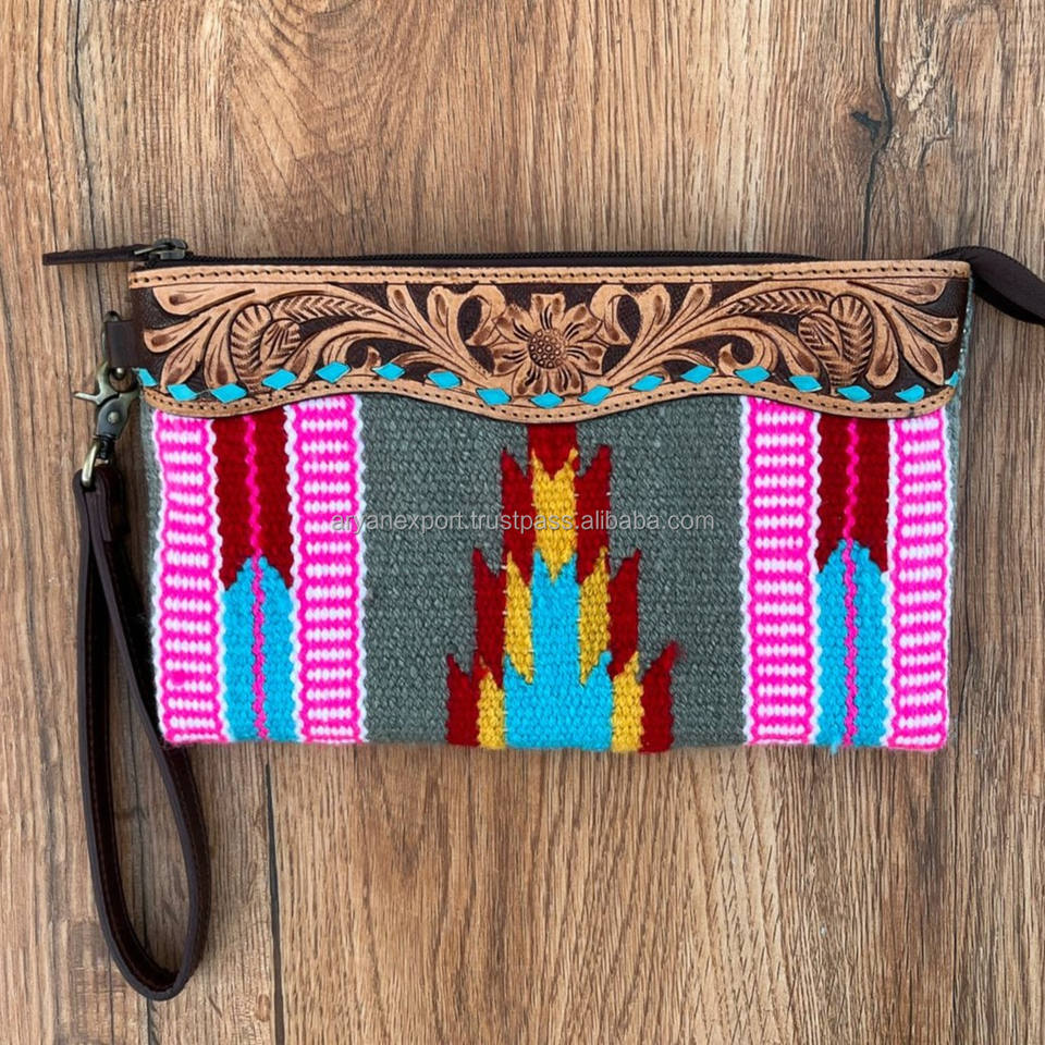 New Stylish Western Aztec Tooled Leather Wristlet Clutch Vintage Brown Tooling Purses Unique Aztec Quilted Leather Wristlet Bag