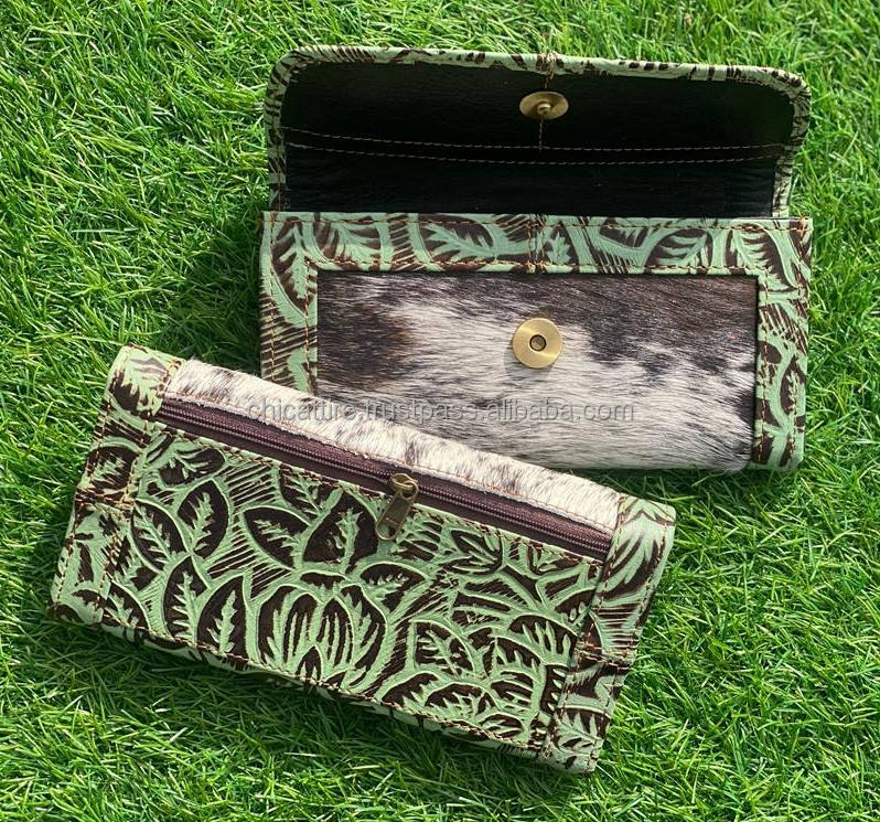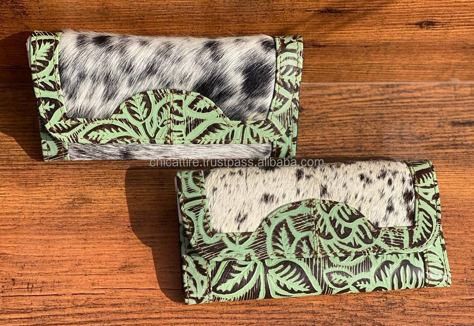 New Stylish Women Cowhide Fur Carving Leather Clutch Handmade Design Phone Carry Purses Hot Sale Embossed Print Trendy Wallets