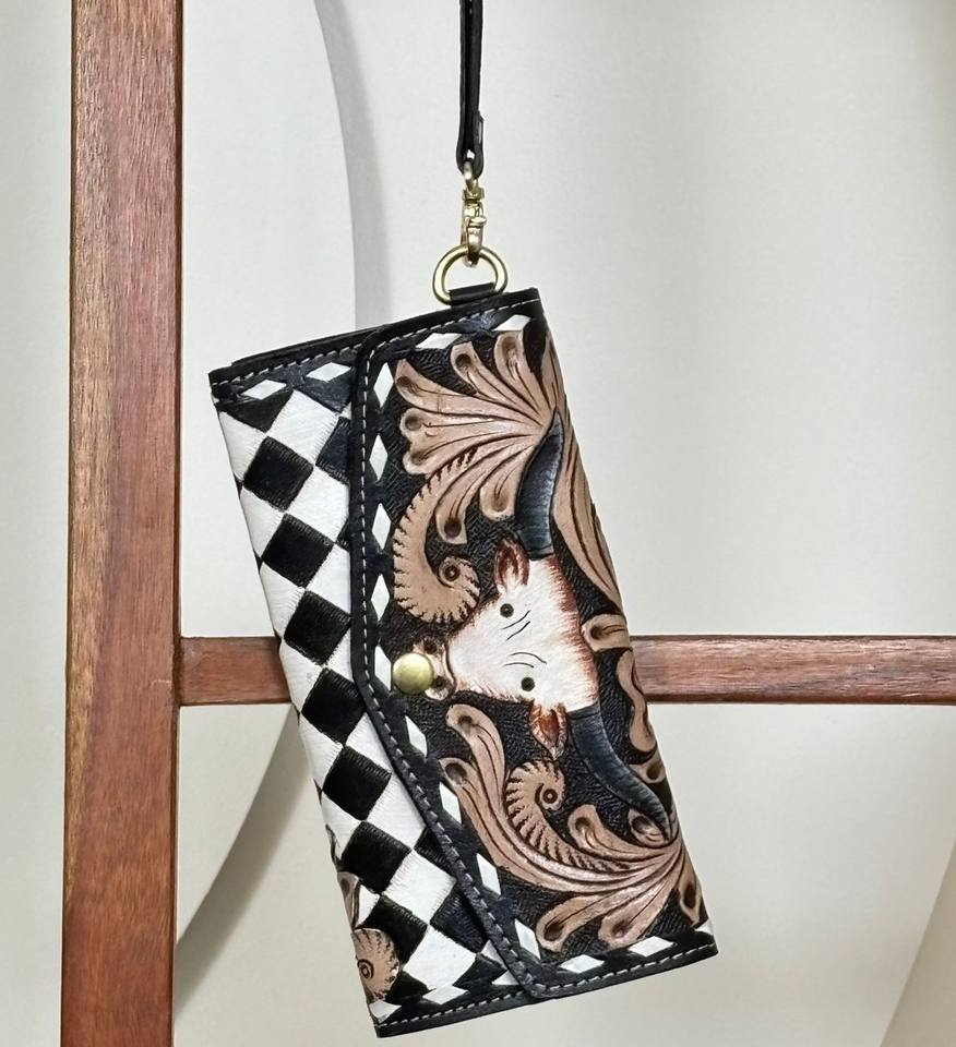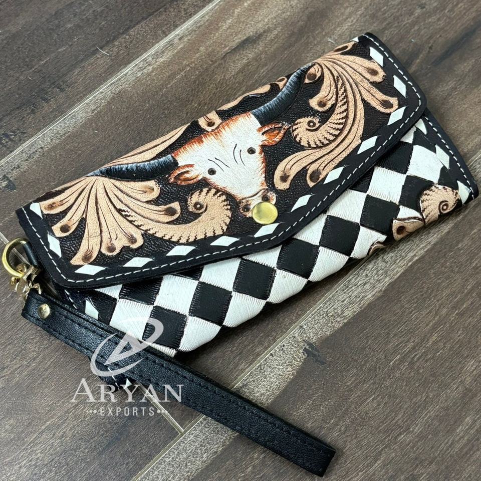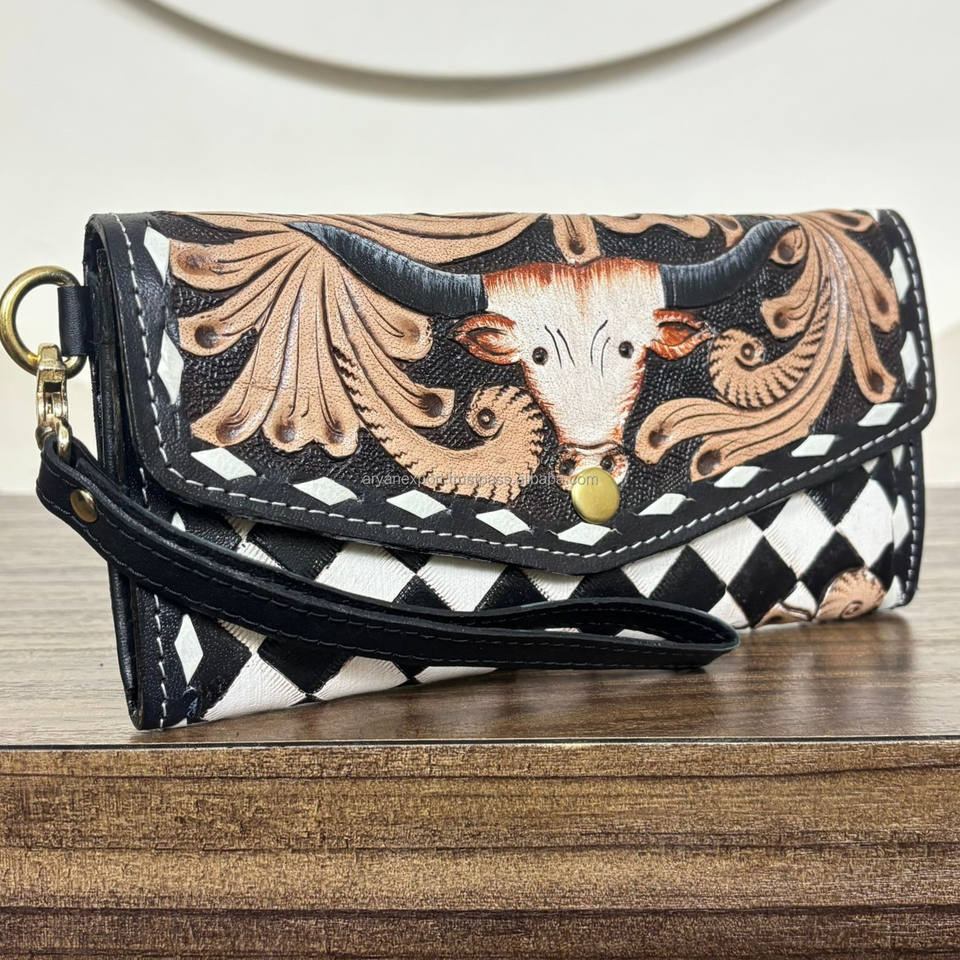 New Tooled Leather Wristlet Wallet for Women Western Longhorn Steer Head Design Checkered Pattern Stylish & Durable Clutch Purse