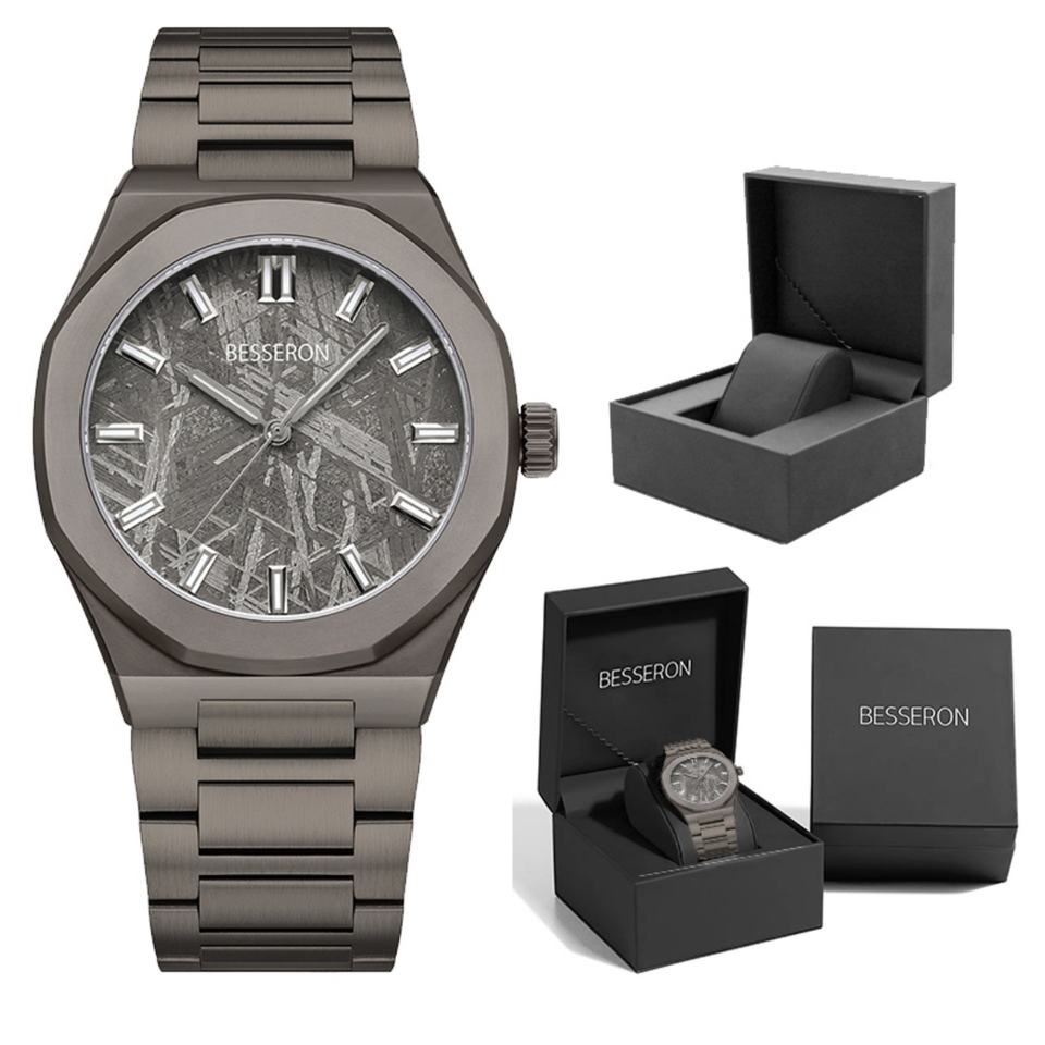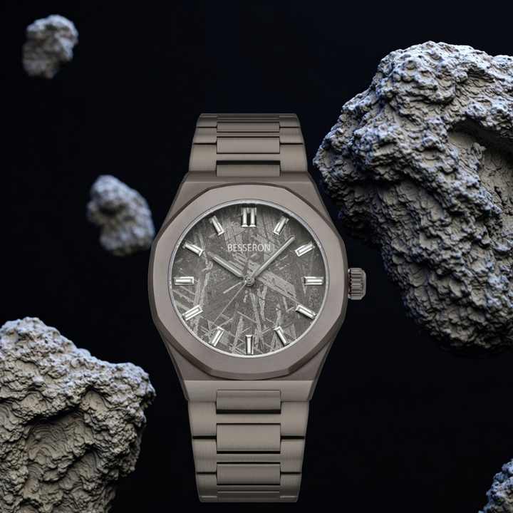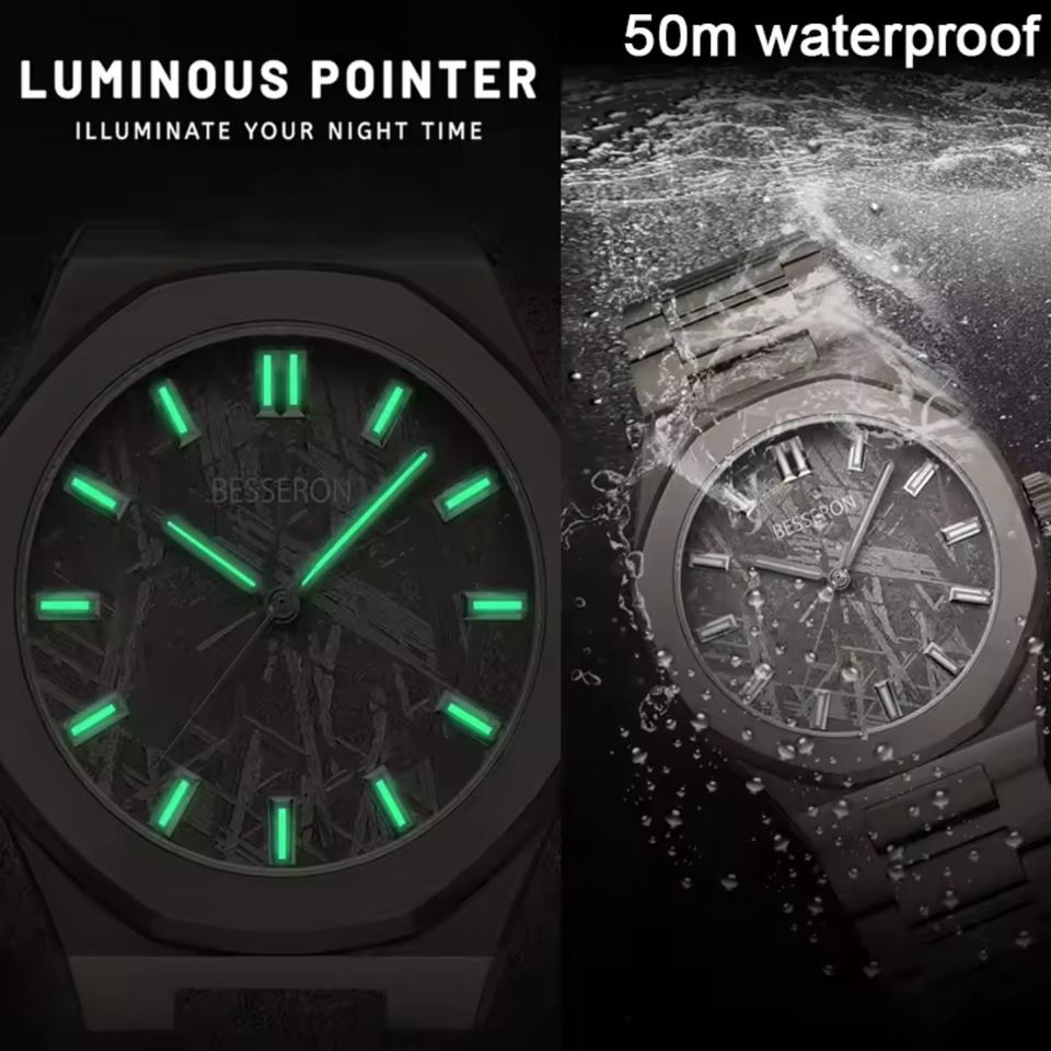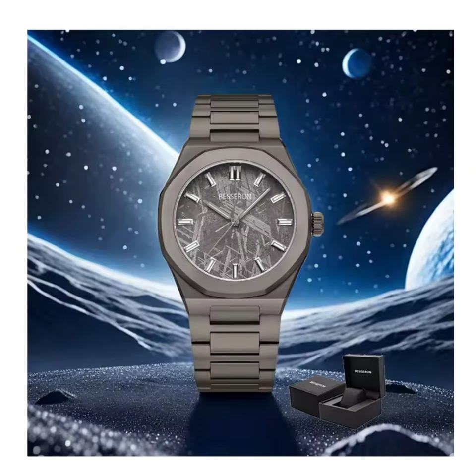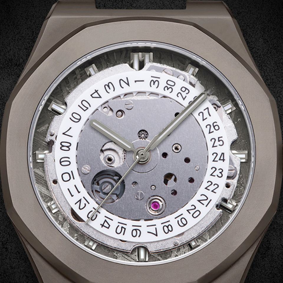 New Trend Men's Stainless Steel Automatic Mechanical Watch Space Gray Plating Sapphire Glass Meteorite Stone Dial Feature Alarm