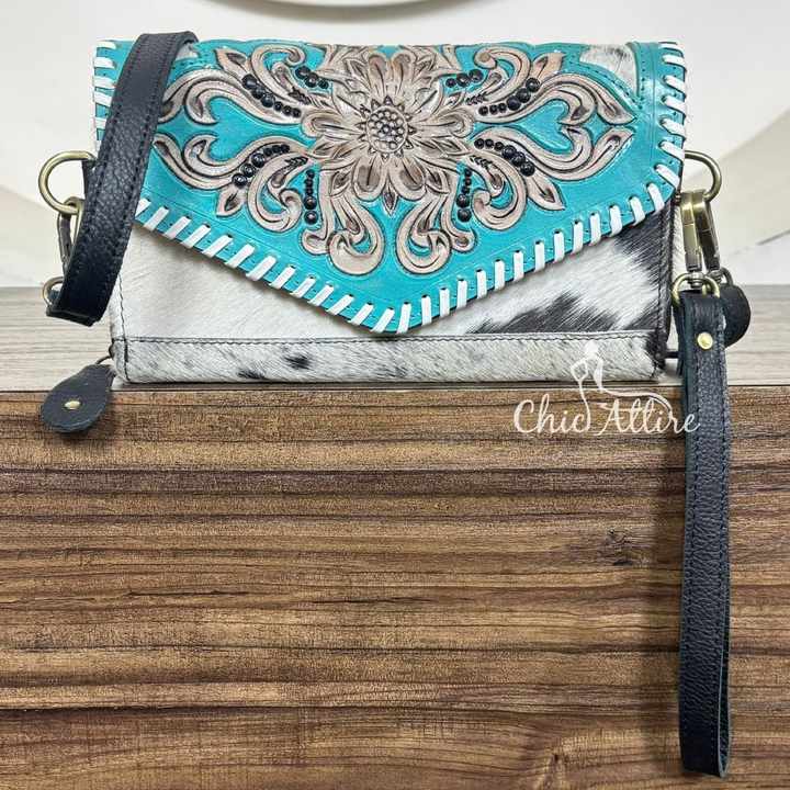 New Trending Western Cowhide Crossbody Bag Embroidered Tooled Flap Purse Handmade Shoulder Bag with Wristlet & Adjustable Strap