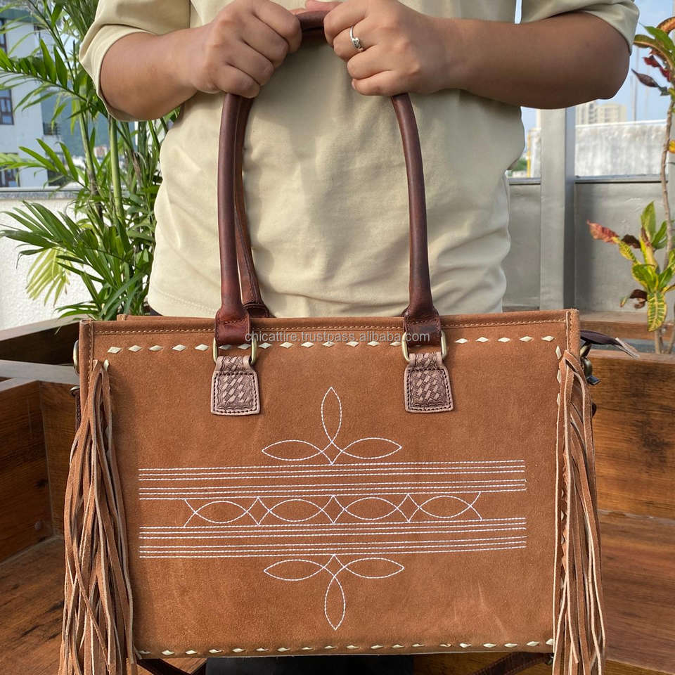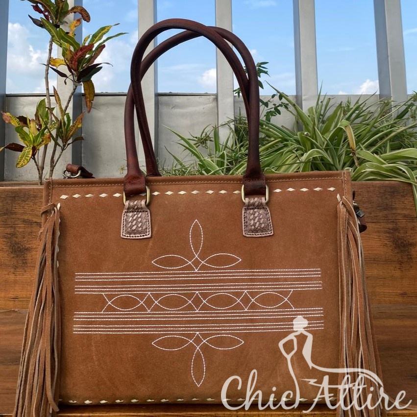 New Trendy Style Tan Suede Leather Fringe Tote Bag Women Boot Stitch Crossbody Handbag Concealed Carry Western Style Daily Use