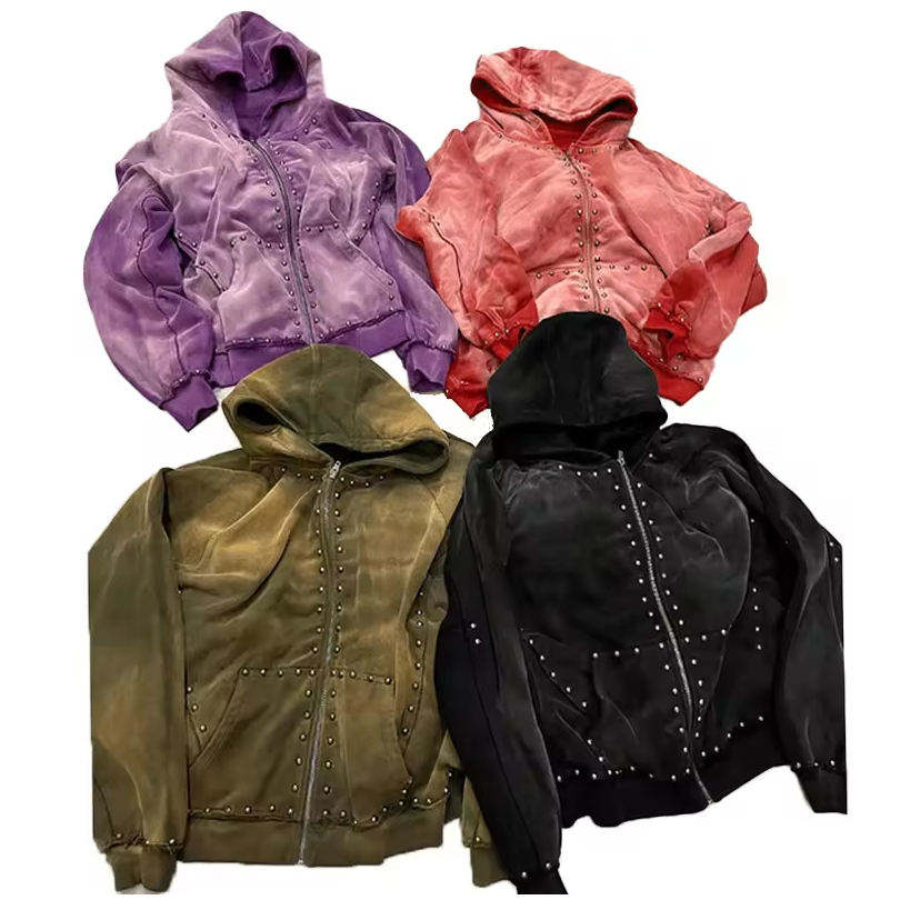 New Trendy Sun Faded Streetwear Acid Wash 500gsm Hoodies Men Zip up Rivet Heavyweight Rhinestone men's hoodieshoodie men