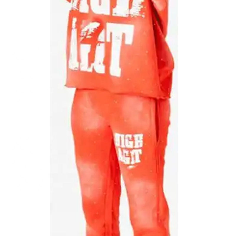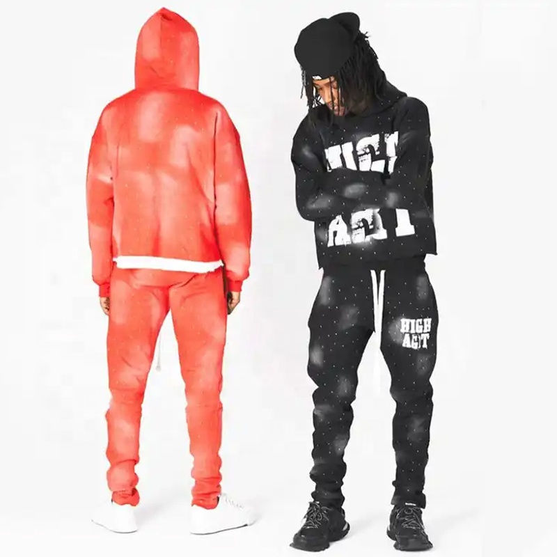 New Trendy Unisex Sun Fade Print All Over Rhinestone Raw Hem French Terry Long String Distress Embroidery Tracksuit Winter Wear