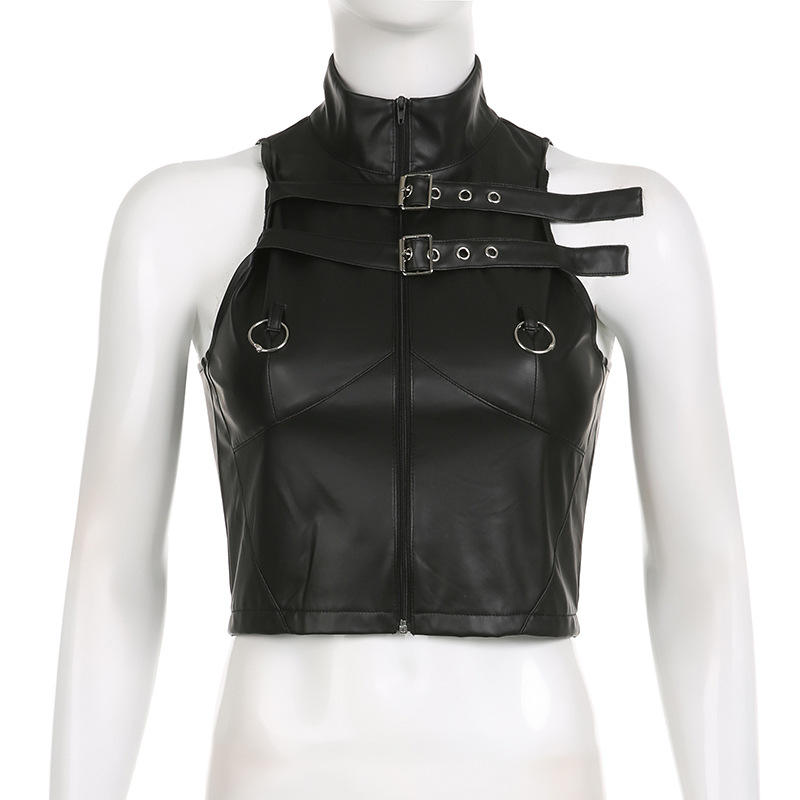 New Trendy Women PU Buckle Belts Vest Camis Zip up Faux Leather Crop Tank Top Women's Leather Clothing