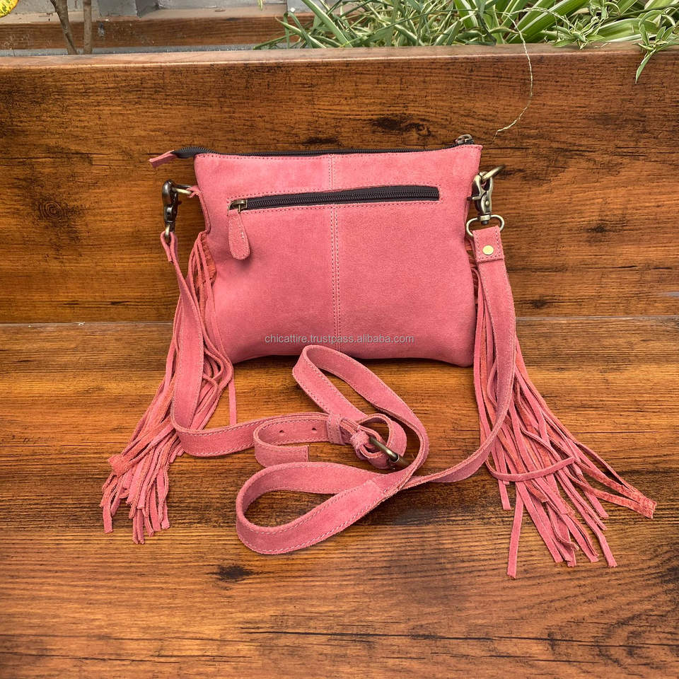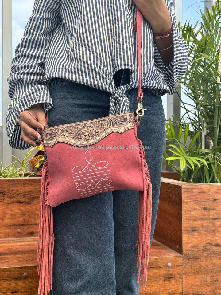 New Trendy Women's Western Leather Boho Hand-Tooled Pink Suede Crossbody Bag with Fringe, Zipper Closure, and Chain Details