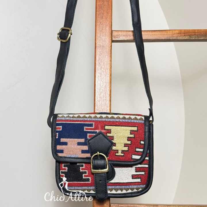 New Tribal Pattern Handmade Genuine Kilim Leather Sling Bag with Adjustable Strap & Multi Pocket Boho Ethnic Women Crossbody Bag