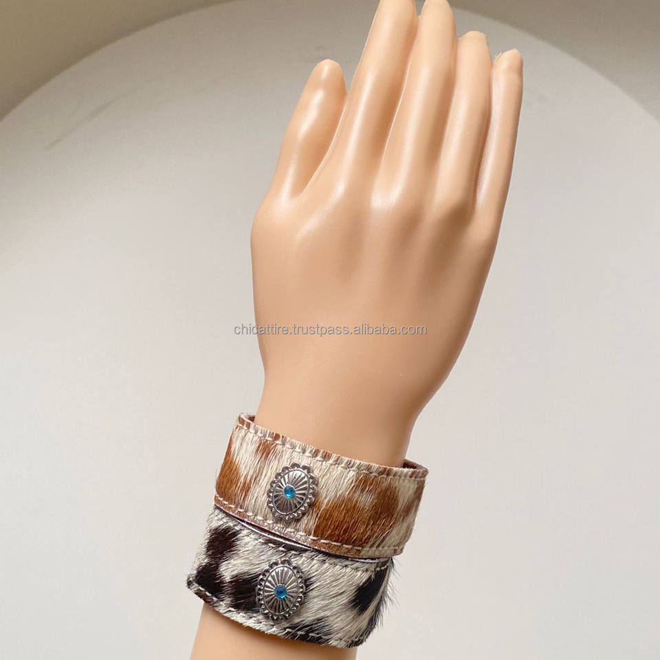 New Turquoise Stone and Genuine Leather Cowhide Cuff Bracelet Western Jewelry Adjustable Snap Hair on Hide Cuff Women's Bracelet