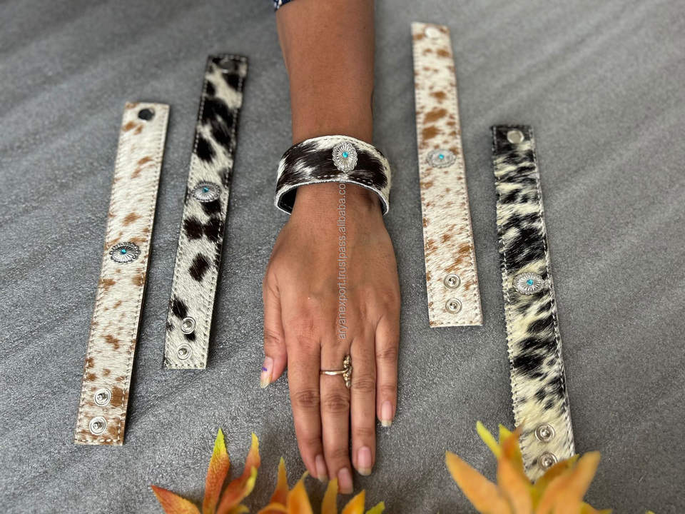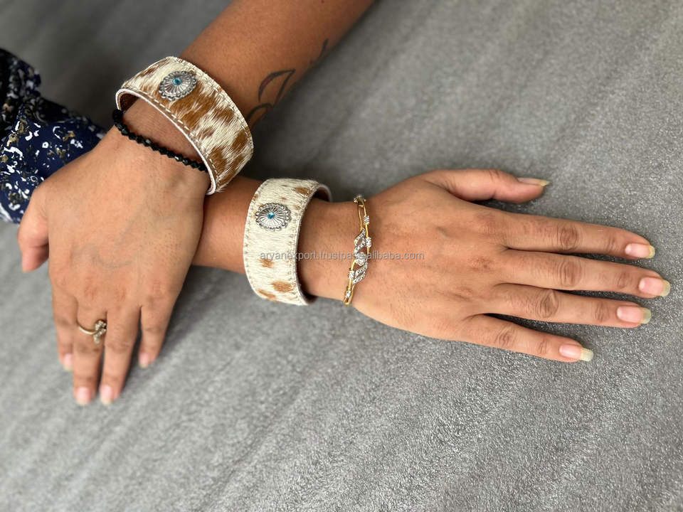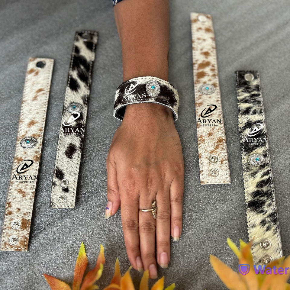 New Turquoise Stone and Genuine Leather Cowhide Cuff Bracelet Western Jewelry Adjustable Snap Hair on Hide Cuff Women's Bracelet
